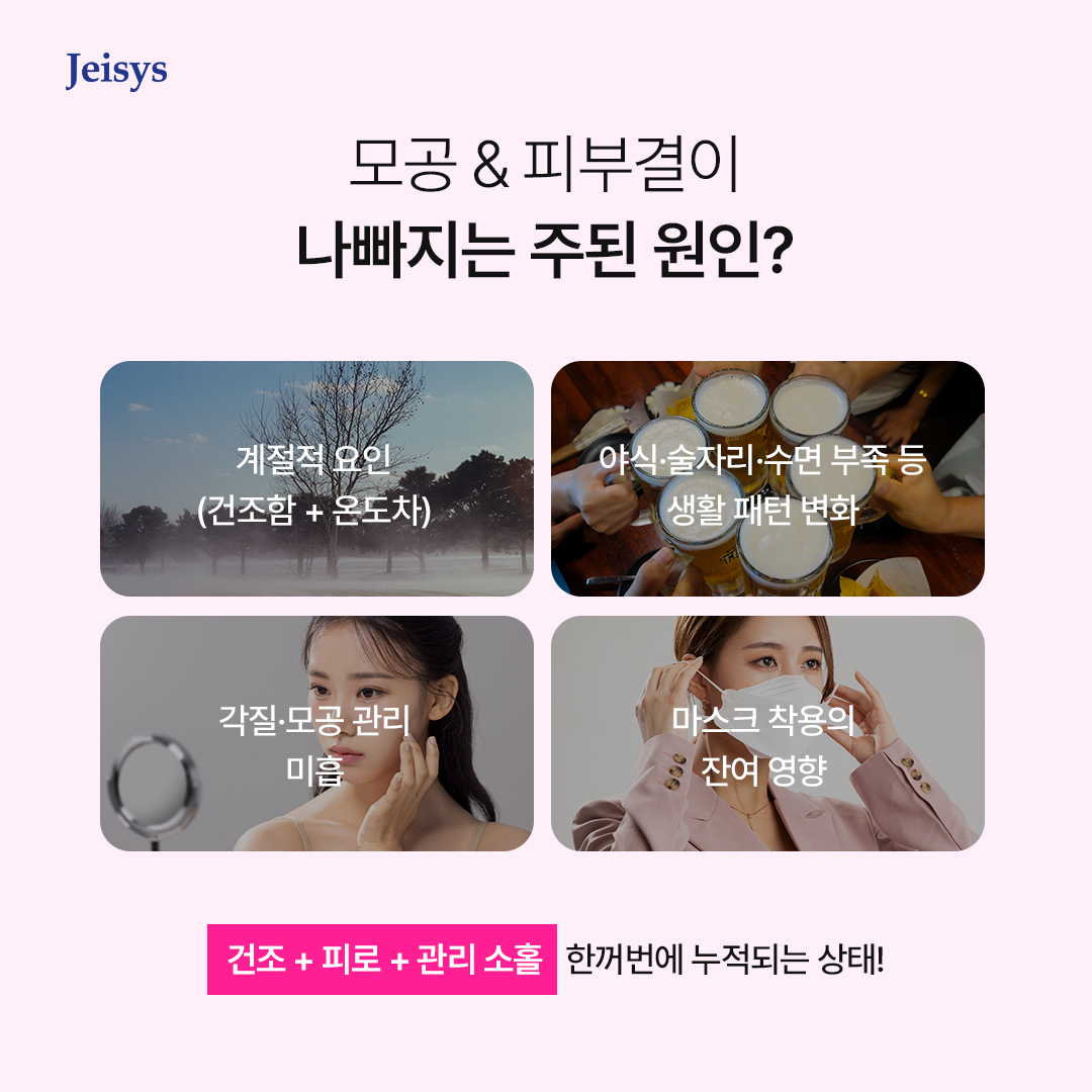 모공이 커지거나 피부결이 거칠어지는 건 갑자기 “뚝!” 하고 생기는 문제가 아니에요. 생활 패턴, 날씨, 피부 컨디션이 조금씩 쌓이다 보면 어느 순간 티가 확 나기 시작하죠.