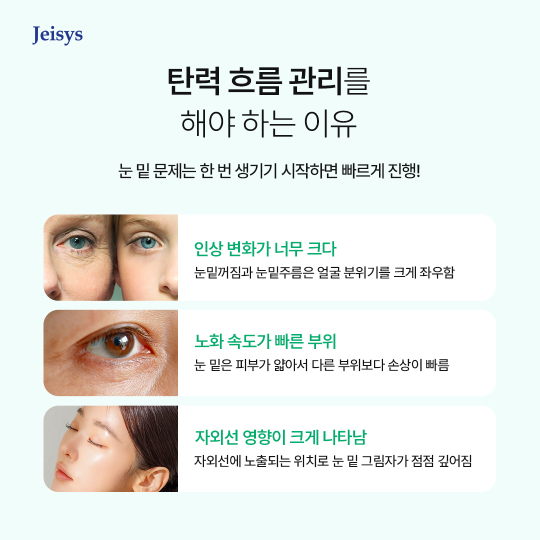 눈 밑은 피부가 얇아서 건조함, 외부 자극, 온도 변화에도 민감해요. 수분이 빨리 빠져나가고 탄력 섬유 손상도 다른 부위보다 빠르거든요. 그래서 눈밑탄력을 챙겨주지 않으면 눈밑주름이 금방 자리 잡고 굴곡도 깊어지는 게 됩니다.