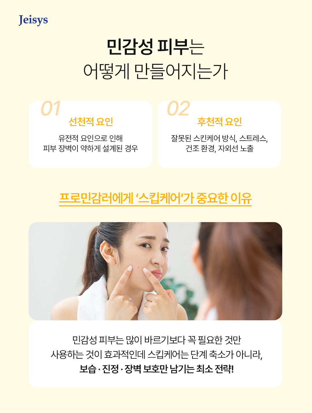 민감성 피부는 선천적·후천적 요인이 복합적으로 작용해 만들어집니다.