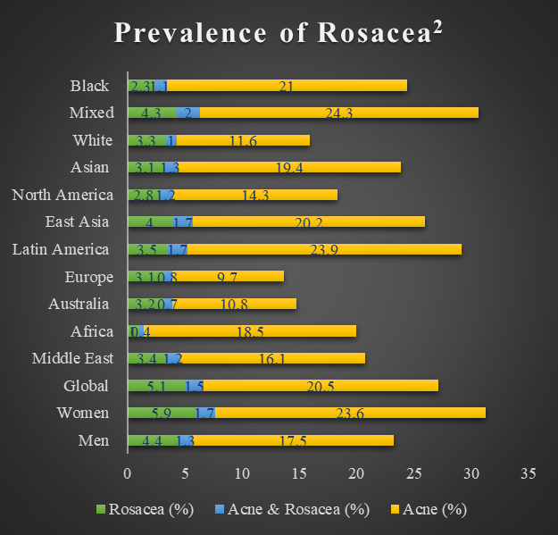 과거에는 유럽 혈통의 밝은 피부를 가진 사람들에게만 영향을 미친다고 믿어왔지만, 이제 우리는 주사피부염이 모든 인종과 피부색에서 발생한다는 것을 알고 있습니다. 실제로 최근의 한 국제 연구에 따르면 주사피부염은 유럽이나 북미보다 동아시아와 라틴 아메리카에서 약간 더 높은 유병률을 보였으며, 이는 밝은 피부를 가진 사람들에게만 나타난다는 신화를 깨뜨렸습니다.