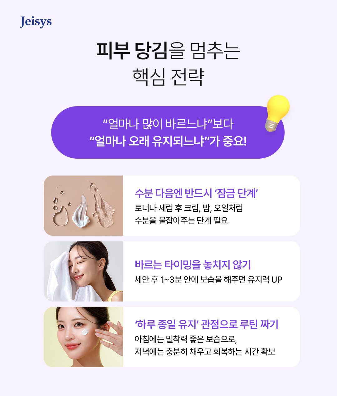아침에는 가볍지만 밀착력 좋은 보습으로 수분관리, 저녁에는 충분히 채우고 회복 시간을 확보하는 보습하는 루틴을 만드는 것도 효과적인 방법입니다.