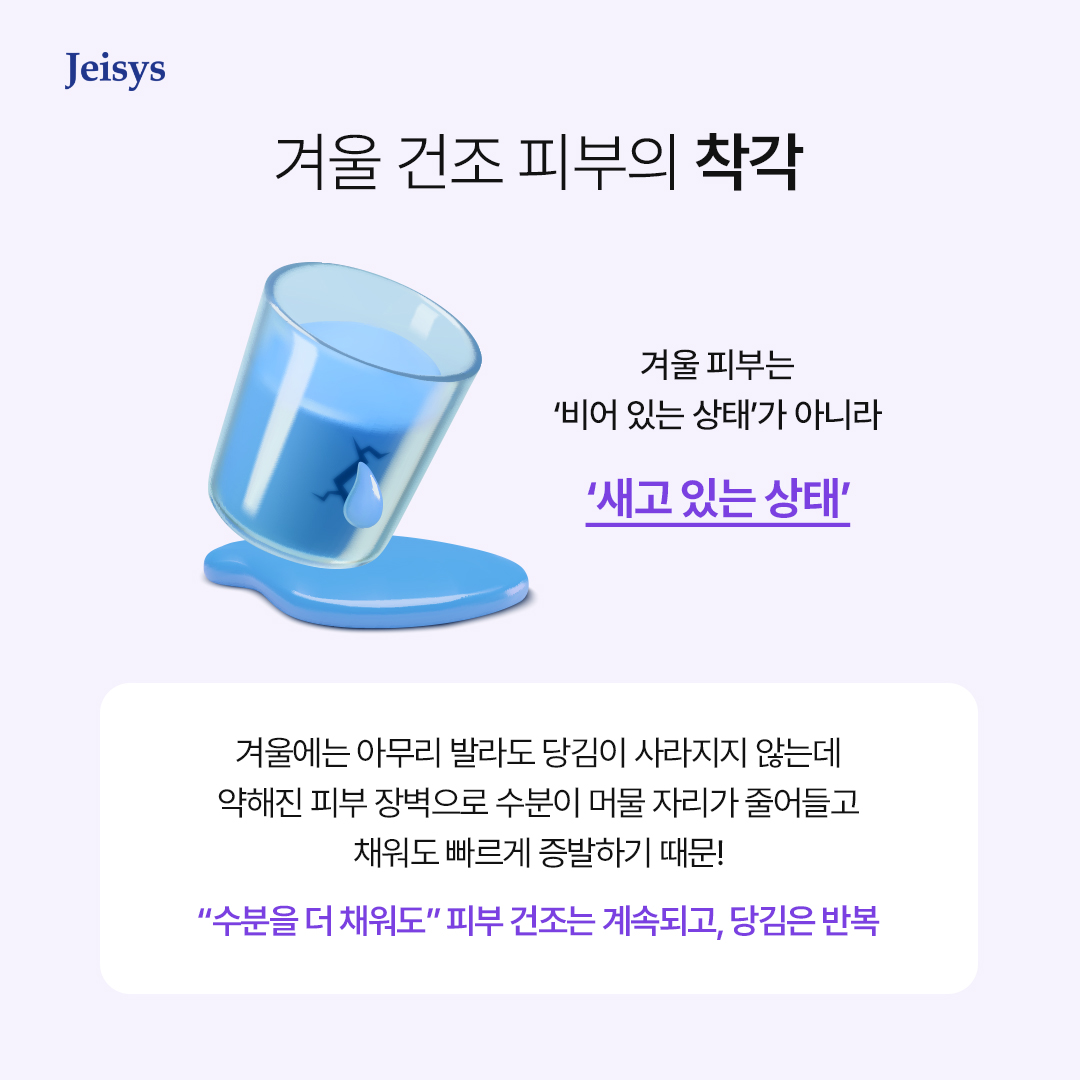 컵에 물을 채우는 것과 금이 간 컵에 물을 채우는 건 전혀 다른 이야기잖아요. 피부도 마찬가지입니다. 겨울에는 피부 장벽이 약해지고 수분이 머물 자리가 줄어들고 채운 수분이 빠르게 증발하는 환경이 됩니다. 따라서 “수분을 더 채워도” 피부건조는 계속되고, 당김은 반복되는 거예요.