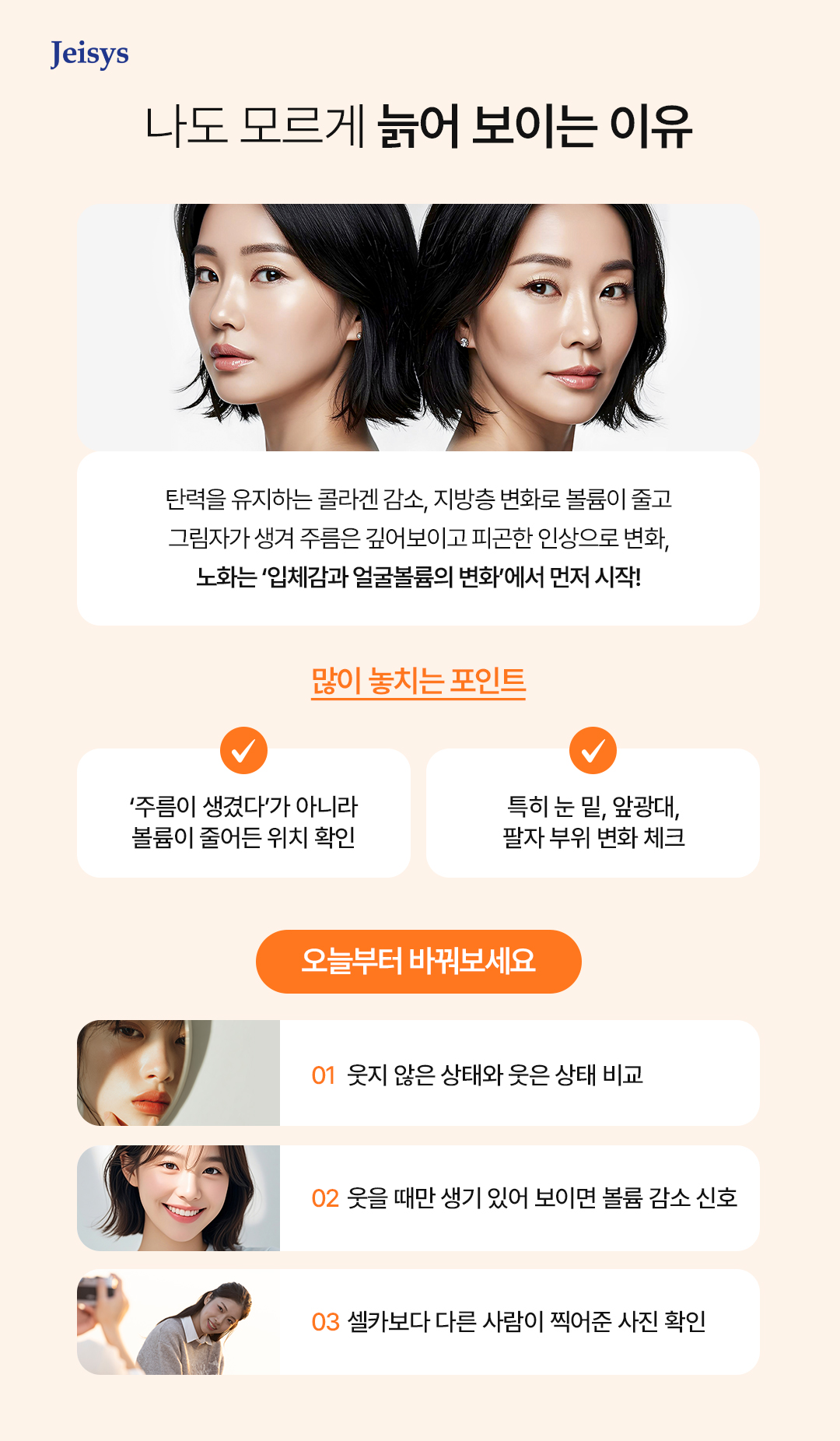 중요한 건, 이 모든 변화가 아주 천천히 일어난다는 점입니다. 그래서 스스로는 잘 느끼지 못하지만 어느 순간 거울을 보거나 사진을 찍었을 때 "왜 이렇게 달라 보이지?"라는 느낌을 받게 되죠. 결국 노화는 주름보다 '입체감과 얼굴볼륨의 변화'에서 먼저 시작된다는 것입니다.
