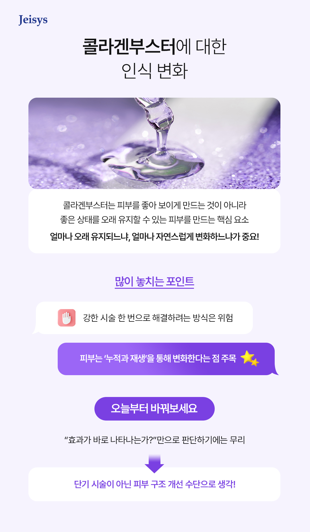 이러한 흐름 속에서 요즘에는 콜라겐부스터에 대한 인식도 크게 달라지고 있습니다. 예전에는 콜라겐부스터를 특정 시술이나 일회성 관리, 단기 효과 중심 정도로 생각하는 경우가 많았죠.