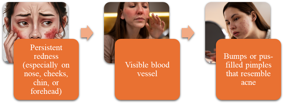 Rosacea is a chronic inflammatory disorder mainly affecting the face. It begins as a tendency to blush easily, but can progress to;
