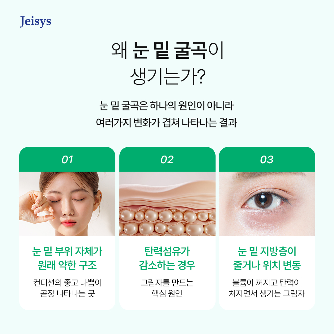 나이가 들수록 피부 탄력을 잡아주는 콜라겐과 엘라스틴이 줄어요. 이 탄력 섬유들이 약해지면 눈 밑이 쉽게 꺼지고 눈 밑–볼 연결선이 움푹 꺼진 것처럼 보이면서 자연스럽게 눈밑주름도 깊어지죠. 이게 바로 피곤해 보이는 그림자를 만드는 핵심 원인이랍니다.