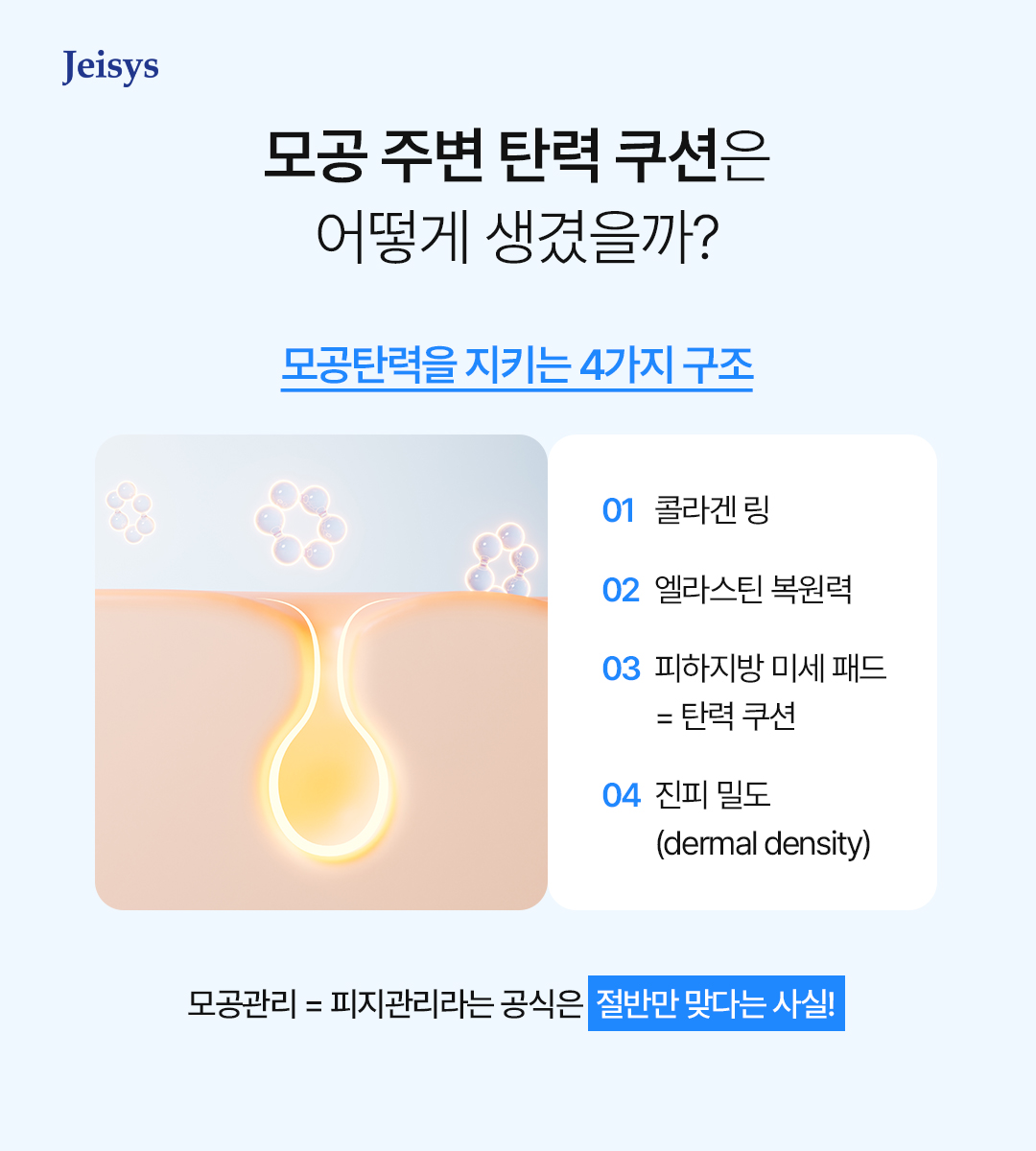 이러한 이유로, 모공관리 = 피지관리라는 공식은 절반만 맞다는 사실, 이제는 이해하셨을 텐데요! 진짜 핵심은 모공 주변 쿠션을 강화해 모공탄력을 회복하는 거니까요.
