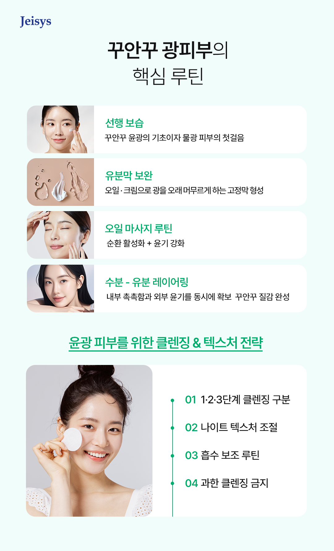 - ④ 자극 최소화 – 민감·트러블 발생 시 즉각적으로 루틴을 간소화하여 장벽 보호