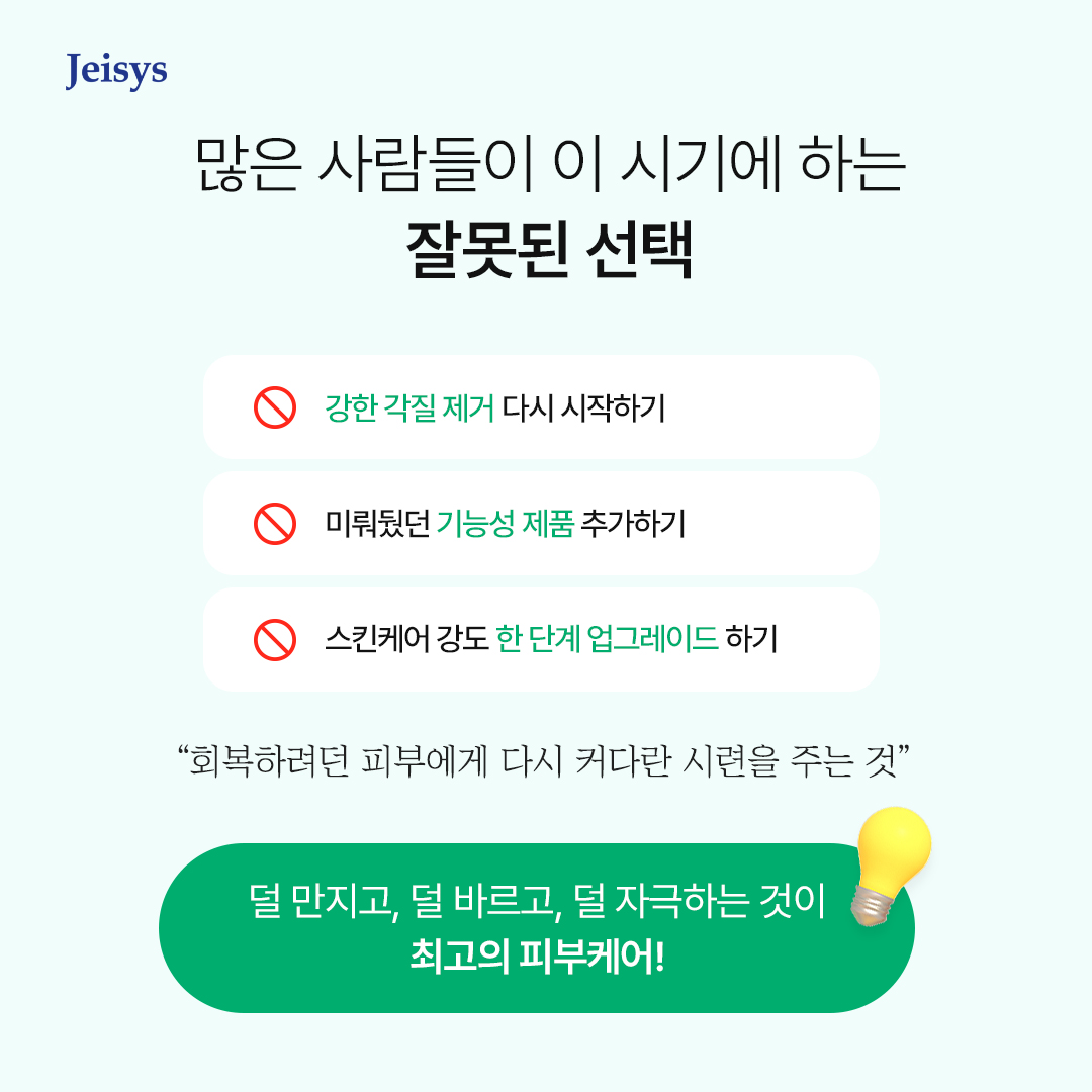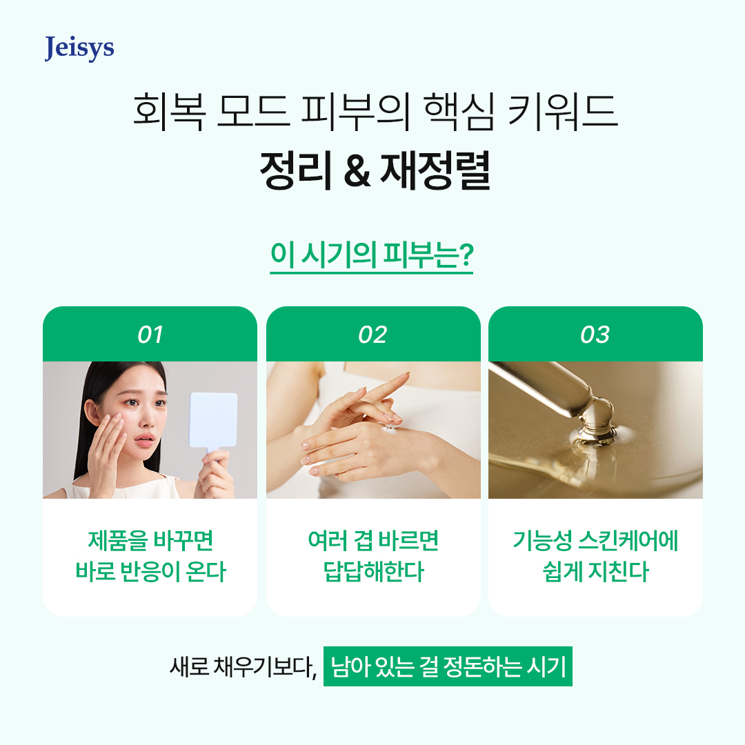 이 시점의 피부는 강하게 관리하면 다시 움츠러들고, 부드럽게 다뤄주면 피부회복 쪽으로 방향을 틉니다.