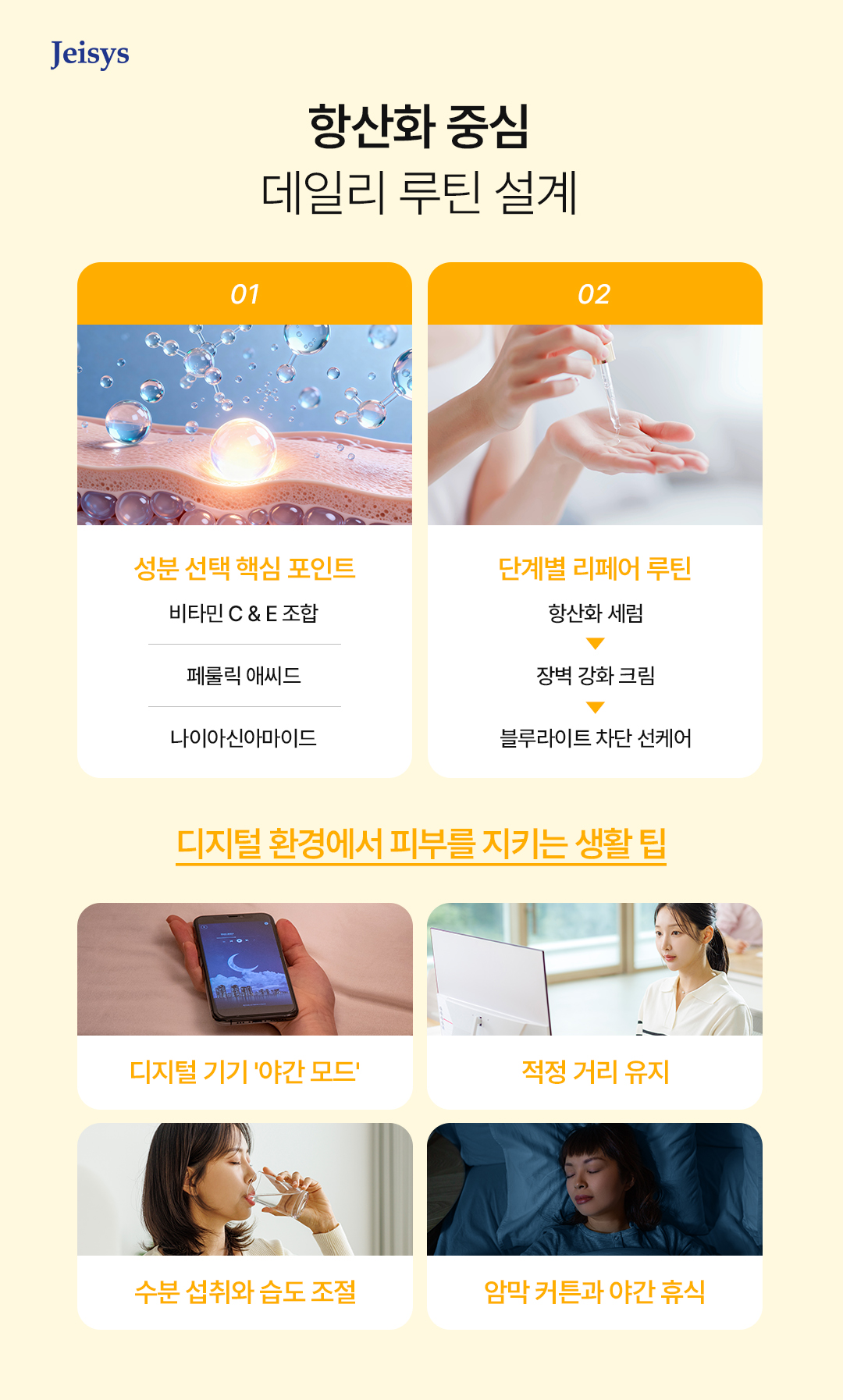 디지털 환경 속에서 피부노화를 늦추기 위한 가장 강력한 무기는 바로 항산화입니다. 블루라이트가 만들어내는 유해한 활성산소를 억제하기 위해, 항산화 성분이 농축된 제품을 체계적으로 사용하는 루틴이 필요한데요.