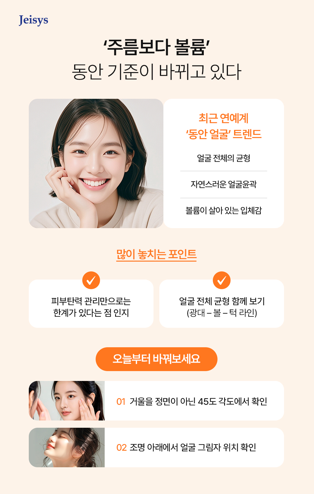 즉, "피부가 좋은 것"보다 "얼굴이 어떻게 보이느냐"가 더 중요해진 것이죠. 그래서 요즘은 피부탄력이 크게 떨어지지 않았더라도, 어딘가 얼굴볼륨이 줄어든 느낌이 들면 더 쉽게 나이 들어 보인다는 인상을 받게 됩니다.